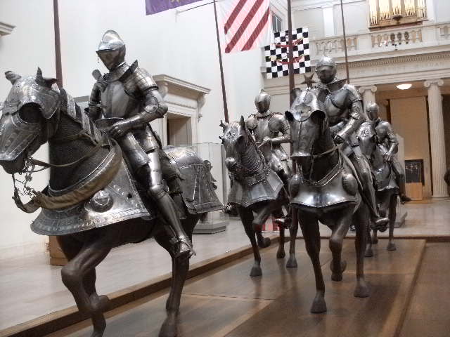And how can I live in a medieval area, and not pay respects to the Arms & Armor section in the MET? I like, how, the men are mounted on horses, both in full armor, ready for battle. Hanging above, are actual designs from the Knights of the Round Table. King Arthur & Lancelot flags are hanging here. Walking along, you come to, amazing tapestries, made by women, who had lots of patience & a critical eye, to catch a wrong stitch. I now appreciate this form of art, knowing, it was mainly a woman’s art. I hope to buy in the future, a simple tapestry for myself –respecting the artistic women who came before me- and their dedication to this art form.